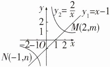 5. 如图,函数$y_1 = x - 1$和$y_2= \frac{2}{x}$的图象交于点