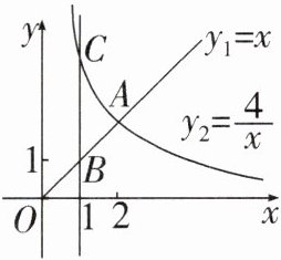4. 函数$y_1 = x(x \geq 0)$,$y_2= \frac{4}{x}(x > 0)$的图象如图所示,下列结论:①两函数图象的交点坐标为$A(2,2)$;②当$x > 2$时,$y_2 > y_1$;③直线$x = 1分别与两函数图象交于B$,$C$两点,线段$BC的长为3$;④当$x$逐渐增大时,$y_1的值随着x$的增大而增大,$y_2的值随着x$的增大而减小。其中正确的是()