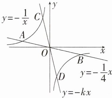 21. (12分)如图,已知双曲线$y = -\frac{1}{x}与两直线y = -\frac{1}{4}x$,$y = -kx(k > 0$,且$k \neq \frac{1}{4})分别相交于A$,$B$,$C$,$D$四点。