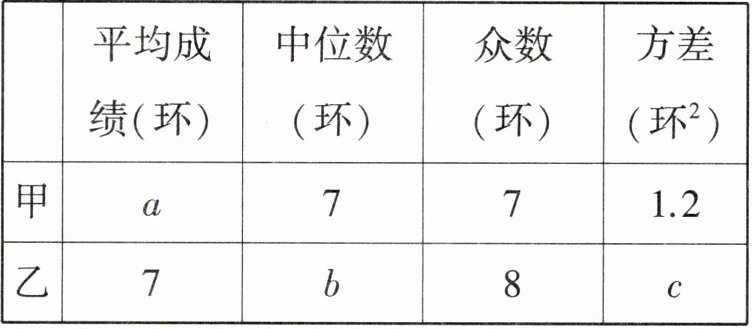 ∴乙射击成绩的中位数$b=\frac{7+8}{2}=7.5$(环),其方差$c=\frac{1}{10}×[(3 - 7)^{2}+(4 - 7)^{2}+(6 - 7)^{2}+2×(7 - 7)^{2}+3×(8 - 7)^{2}+(9 - 7)^{2}+(10 - 7)^{2}]=\frac{1}{10}×(16+9+1+3+4+9)=4.2$(环²).
