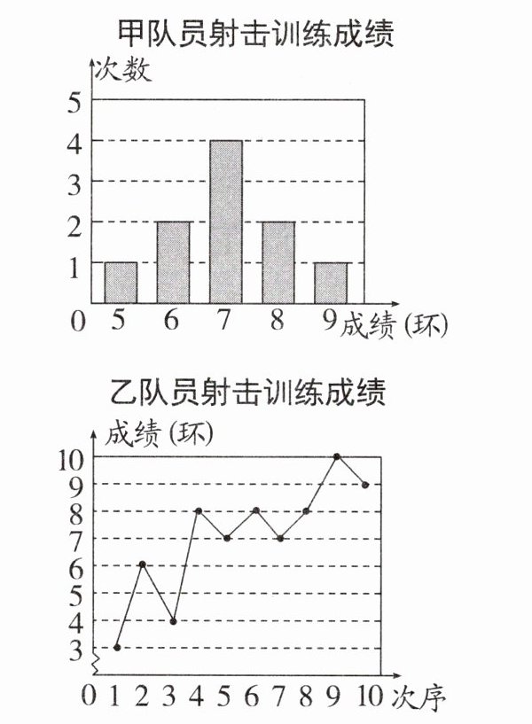 (2)从平均成绩看:甲、乙二人的成绩相等,均为7环;从中位数看:甲射中7环以上的次数小于乙;从众数看:甲射中7环的次数最多,而乙射中8环的次数最多;从方差看:甲的成绩比乙的成绩稳定.综合以上各因素,若选派一名队员参加比赛的话,可选择乙参赛,因为乙获得高分的可能更大(答案不唯一,合理即可).