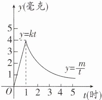 14. 某医药研究所开发一种新药,成年人按规定的剂量服用,服药后每毫升血液中的含药量$y$(毫克)与时间$t$(时)之间的函数关系近似满足如图所示曲线,当每毫升血液中的含药量不少于$0.8$毫克时治疗有效,则服药后治疗疾病的有效时间为______小时.