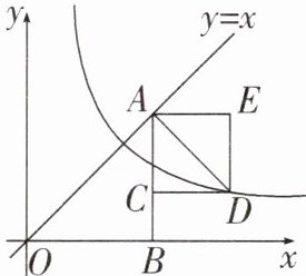 16. 如图,点$A在直线y = x$上,$AB \perp x轴于点B$,点$C在线段AB$上,以$AC为边作正方形ACDE$,点$D恰好在反比例函数y = \frac{k}{x}$($k$为常数,$k \neq 0$)第一象限的图象上,连结$AD$.若$OA^2 - AD^2 = 20$,则$k$的值为______.