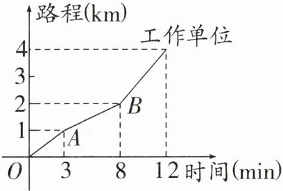 8. 小高从家骑车去工作单位上班,先走平路到达点$A$,再走上坡路到达点$B$,最后走下坡路到达工作单位,所用的时间与路程的关系如图所示.下班后,如果他沿原路返回,且走平路、上坡路、下坡路的速度分别保持和去上班时的一致,那么小高从工作单位到家门口需要的时间是()