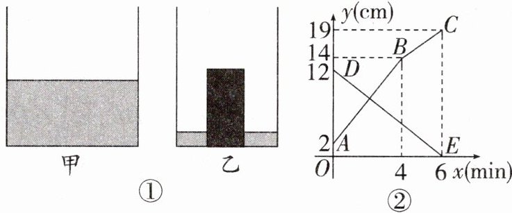 19. 如图①是甲、乙两个圆柱形水槽的横截面示意图,乙槽中有一个圆柱形铁块(圆柱形铁块的下底面完全落在水槽底面上).现将甲槽中的水匀速注入乙槽,甲、乙两个水槽中水的深度$y(cm)与注水时间x(min)$之间的关系如图②所示.根据图象提供的信息,解答下列问题.