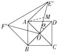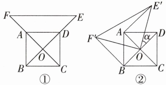 21. 如图①,$ O $ 为正方形 $ ABCD $ 的中心,分别延长 $ OA $ 到点 $ F $,$ OD $ 到点 $ E $,使 $ OF = 2OA $,$ OE = 2OD $,连结 $ EF $,将 $ \triangle FOE $ 绕点 $ O $ 按逆时针旋转 $ \alpha $ 角得到 $ \triangle F'OE' $(如图②).