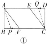 (2)①显然当P点在AF上,Q点在CD上时,A,C,P,Q四点不可能构成平行四边形;同理P点在AB上,Q点在DE或CE上时,也不能构成平行四边形;P点在BF上,Q点在CD上时,也不能构成平行四边形。因此只有当P点在BF上,Q点在ED上时,才能构成平行四边形(如图①所示),