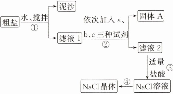 【解析】粗盐溶解后过滤可除去难溶性泥沙。向滤液1中加入NaOH溶液可除去$Mg^{2+}$,加入$BaCl_{2}$溶液可除去$SO_{4}^{2-}$,加入$Na_{2}CO_{3}$溶液可除去$Ca^{2+}$和过量的$Ba^{2+}$,故必须先加$BaCl_{2}$溶液再加$Na_{2}CO_{3}$溶液,过滤分离出固体A。向滤液2中加入盐酸可除去过量的NaOH和$Na_{2}CO_{3}$,蒸发结晶得到氯化钠晶体。
