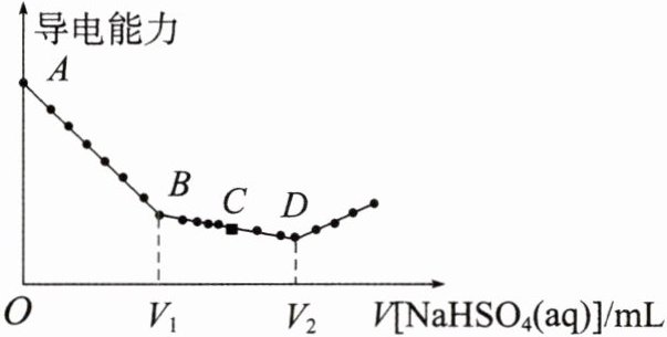 【解析】Ⅰ.$NaHSO_{4}$在水溶液中的电离方程式为$NaHSO_{4}=Na^{+}+H^{+}+SO_{4}^{2-}$,加入的物质可以与$NaHSO_{4}$电离出的离子发生反应。Ⅱ.电解质溶液或熔融电解质导电的原因是存在自由移动的离子,向$Ba(OH)_{2}$溶液中逐滴加入$NaHSO_{4}$溶液,反应生成$H_{2}O$和$BaSO_{4}$沉淀,溶液中离子浓度减小,导电能力减弱;B点时,$Ba^{2+}$恰好完全沉淀,$OH^{-}$反应了一半,此时消耗$NaHSO_{4}$溶液的体积为$V_{1}mL$;继续滴加$NaHSO_{4}$溶液,$OH^{-}$继续和$H^{+}$反应生成$H_{2}O$,导电能力继续减弱;D点时,$OH^{-}$恰好完全反应,此时消耗$NaHSO_{4}$溶液的体积为$V_{2}mL$;继续滴加$NaHSO_{4}$溶液,此时$NaHSO_{4}$溶液过量,溶液中自由移动的离子浓度增大,溶液的导电能力又增强。