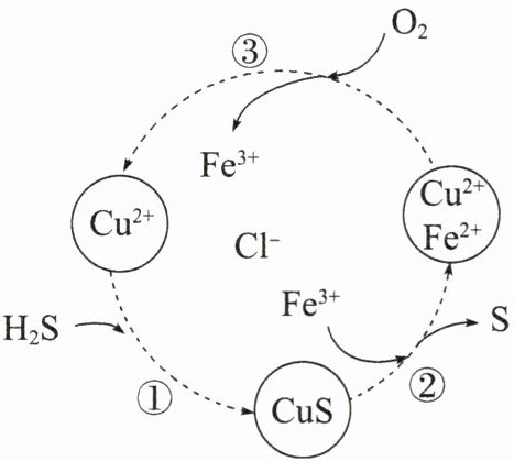 (1)由图可知,过程①发生反应$H_{2}S+Cu^{2+}=CuS\downarrow+2H^{+}$,过程②发生反应$CuS+2Fe^{3+}=S+2Fe^{2+}+Cu^{2+}$,过程③发生反应$4Fe^{2+}+O_{2}+4H^{+}=4Fe^{3+}+2H_{2}O$,回收S的总反应为$2H_{2}S+O_{2}=2H_{2}O+2S\downarrow$。