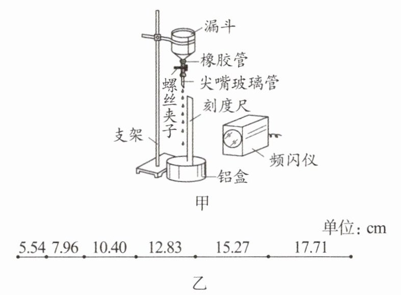 7.测定当地的重力加速度的装置如图甲所示,该实验要在暗室中进行,实验器材包括:频闪仪(带照相功能)、尖嘴玻璃管、螺丝夹子、接水铝盒、带荧光刻度的刻度尺、支架、漏斗、橡胶管等。