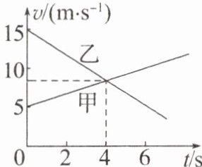 10.BD 由题图可知,甲、乙两车运动方向相同,均为正方向,A错误;根据v - t图像的斜率表示加速度,由题图可知,甲、乙两车的加速度方向相反,B正确;若$t = 0$时,两车从同一地点出发,由题图可知,0~4s内乙车的速度一直大于甲车的速度,则$t = 4s$,乙车在甲车的前面,C错误;根据v - t图像与横轴围成的面积表示位移可知,0~4s内乙车通过的位移比甲车通过的位移大$\Delta x=\frac {1}{2}×(15 - 5)×4m=20m$,若$t = 0$时,甲车在乙车前方30m处,则$t = 4s$,乙车在甲车的后面,由于$t = 4s$后,乙车的速度小于甲车的速度,则两车不可能相遇,D正确。