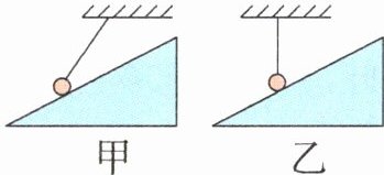 - 假设两图中的斜面不存在,图甲中小球由于细绳倾斜,重力会使小球有沿斜面向下运动的趋势,无法在原位置保持静止,这说明斜面给小球一个支持力(弹力)来平衡重力沿斜面向下的分力,使小球能保持当前状态;而图乙中小球在细绳竖直的情况下,重力与细绳拉力在同一直线上,若斜面不存在,小球仍能在原位置静止,说明斜面没有给小球弹力。