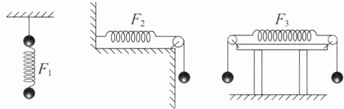 6. 如图所示的装置中,小球的质量均相同,弹簧和细线的质量均不计,一切摩擦忽略不计,平衡时各弹簧的弹力分别为$F_{1}$、$F_{2}$、$F_{3}$,其大小关系是(