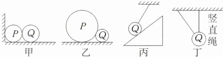 甲图中地面对Q有向上的弹力,假设两球间有弹力则小球Q将向右运动,可知P、Q间无弹力,即Q只受一个弹力;乙图地面对Q有向上的弹力,假设两球间有弹力则两球将向两边运动,可知PQ间无弹力,即Q只受一个弹力;丙图中Q受细绳的拉力和斜面的支持力两个弹力作用;丁图中因上面的细绳竖直,可知旁边的细绳无弹力,否则中间细绳不会竖直,即Q只受一个弹力。故选C。