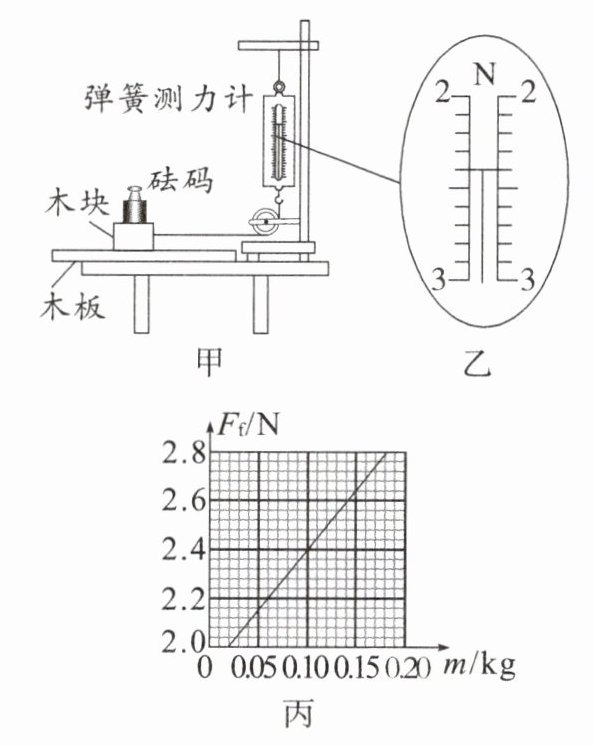 N。(3) 为进行多次实验, 该同学采取了在木块上增加砝码个数的方法。木块的质量为 $ m_0 $, 砝码的总质量为 $ m $、木块与木板之间的动摩擦因数为 $ \mu $, 测得多组数据后, 该同学描绘的 $ F_f - m $ 图像如图丙所示, 图像直线未过原点, 根据图像可得, 木块的质量 $ m_0 = $