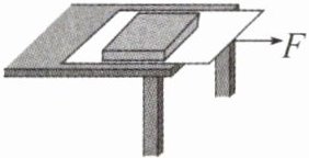 6. 如图所示, 将一重力不计的白纸夹在课本与水平桌面之间, 现用水平拉力 $ F $ 将白纸从课本底下向右抽出 (课本未从桌面滑落), 已知课本的重力为 $ G $, 所有接触面间的动摩擦因数均为 $ \mu $。在白纸被抽出的过程中 (