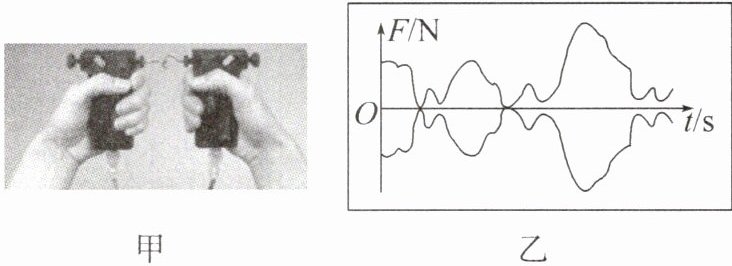 3.(多选)用计算机辅助实验系统做验证牛顿第三定律的实验,点击实验菜单中“力的相互作用”。如图甲所示,把两个探头的挂钩钩在一起,向相反的方向拉动,观察显示器的屏幕上出现的结果如图乙所示。观察分析两个相互作用力随时间变化的曲线,可以得到以下实验结论,正确的是(