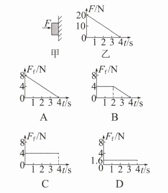 7. 如图甲所示,用水平力$F$将质量为0.4kg的物体压在竖直墙壁上静止不动,物体与墙面间的动摩擦因数为0.4。若力$F随时间t$变化的规律如图乙所示,$g取10m/s^{2}$,设最大静摩擦力等于滑动摩擦力,则下列图像中,能正确反映物体所受墙的摩擦力大小$F_{f}随时间t$变化规律的是 (