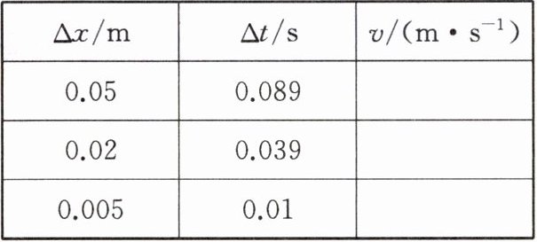 (1)由$v=\frac{\Delta x}{\Delta t}$分别代入三组数据,可求得三个速度分别为$v_{1}=\frac{0.05m}{0.089s}\approx0.56m/s$、$v_{2}=\frac{0.02m}{0.039s}\approx0.51m/s$、$v_{3}=\frac{0.005m}{0.01s}=0.50m/s$。