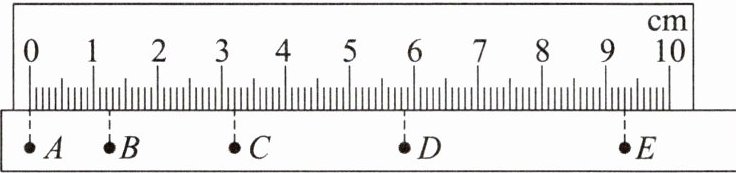 【解析】物块沿倾斜的长木板加速下滑,在相等时间内位移越来越大,据此判断最先打出的点为A;纸带上标出的每两个相邻点之间还有4个打出的点未画出,故每两点间时间间隔$T=\frac{1}{f}\times5=0.1s$;题图中刻度尺分度值为0.1cm,A、E间距离为9.30cm。