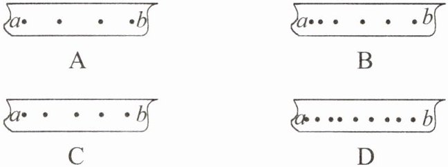 3. 同一打点计时器在四条水平运动的纸带上打出的点如图所示,纸带的长度相同,其中a、b间的平均速度最大的是(