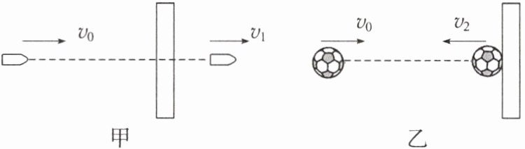 4. 子弹和足球均以50 m/s的速度水平向右作用于木板。子弹与木板的作用时间是0.01 s,子弹击穿木板后速度方向不变,大小变为40 m/s,如图甲所示;足球与木板的作用时间是0.2 s,作用后足球反向弹回的速度大小也为40 m/s,如图乙所示。规定向右为正方向。关于子弹和足球的速度变化率的比较,下列说法正确的是(