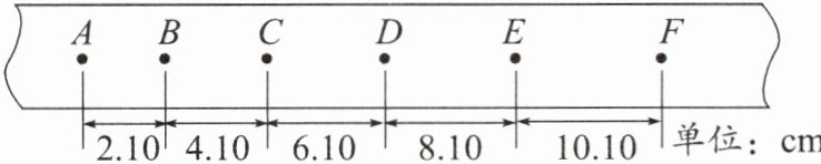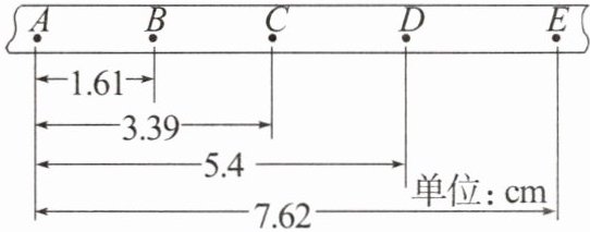 [解析]毫米刻度尺测量结果应准确到1mm,估读到0.1mm,所以不符合正确读数要求的数据是5.4。两相邻计数点间均有4个点未画出,相邻计数点间的时间间隔T = 0.1s,B点对应的小车速度vB = $\frac{x_{AC}}{2T}$≈0.17m/s,同理可求出D点对应的小车速度vD = $\frac{x_{AE}-x_{AC}}{2T}$≈0.21m/s,由加速度定义式a = $\frac{\Delta v}{\Delta t}$得a = $\frac{v_D - v_B}{2T}$,联立可得a = 0.20m/s²。