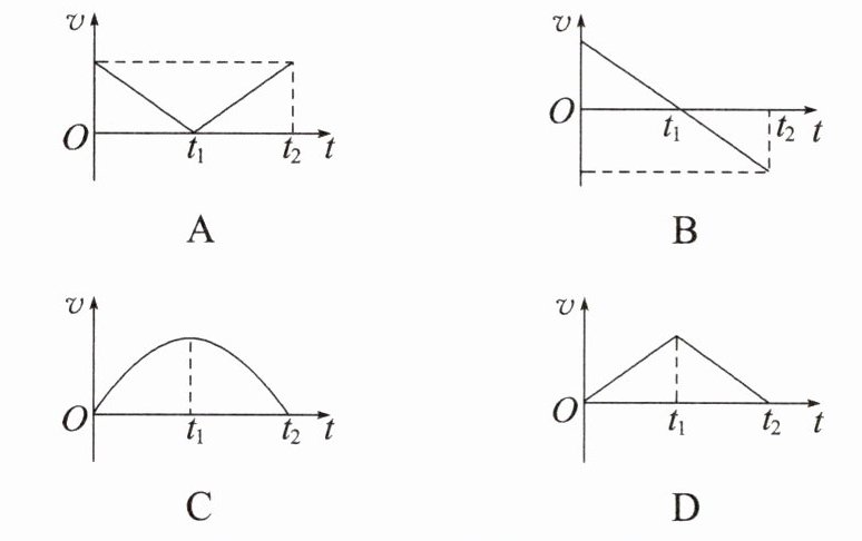 D A选项图像表示的是小车先沿正方向做匀减速直线运动,后沿正方向做匀加速直线运动,A错误;B选项图像表示的是小车先沿正方向做匀减速直线运动,后沿负方向做匀加速直线运动,B错误;$v - t$图像斜率的绝对值表示加速度大小,C选项图像表示的是小车先沿正方向做加速度减小的加速直线运动,后沿正方向做加速度增大的减速运动,C错误;D选项图像表示的是小车先沿正方向做匀加速直线运动,后沿正方向做匀减速直线运动,D正确。