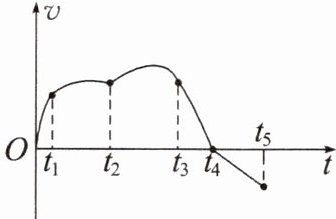 A $0~t_4$时间内小鱼的速度始终为正值,即小鱼一直向前运动,到$t_4$时刻速度为零,小鱼在$t_4$时刻离出发点最远,A正确;由题图可知在$t_4$时刻图像的斜率不为零,$v - t$图像的斜率表示加速度,所以加速度不为零,B错误;在$t_4~t_5$时间内小鱼速度反向增大,即反方向做加速运动,速度与加速度方向相同,C错误;在$0~t_1$时间内图像的斜率为正,加速度方向为正方向,$t_3~t_4$时间内图像的斜率为负,加速度方向为负方向,故两段时间内的加速度方向不相同,D错误。