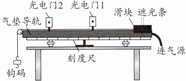 12. (9分)某同学采用了如图所示的实验装置来完成“研究匀变速直线运动的规律”实验。放置在气垫导轨上的滑块上装有宽度$d= 3.0mm$的遮光条,滑块在牵引力作用下先后通过两个光电门,配套的数字计时器(图中未画出)记录了遮光条通过光电门1的时间$\Delta t_{1}= 0.02s$,通过光电门2的时间$\Delta t_{2}= 0.01s$,用刻度尺测出两个光电门之间的距离$x= 22.5cm$,则遮光条经过光电门1时的速度大小$v_{1}= $