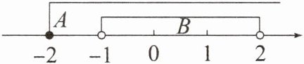 (1)(数形结合法)$\because y = x ^ { 2 } - 2 x - 1 = x ^ { 2 } - 2 x + 1 - 2 = ( x - 1 ) ^ { 2 } - 2 \geqslant - 2, \therefore A = \{ y | y \geqslant - 2 \} $.将集合$ A, B $在数轴上表示出来,如图所示,结合数轴,可知$ B \subsetneqq A $.