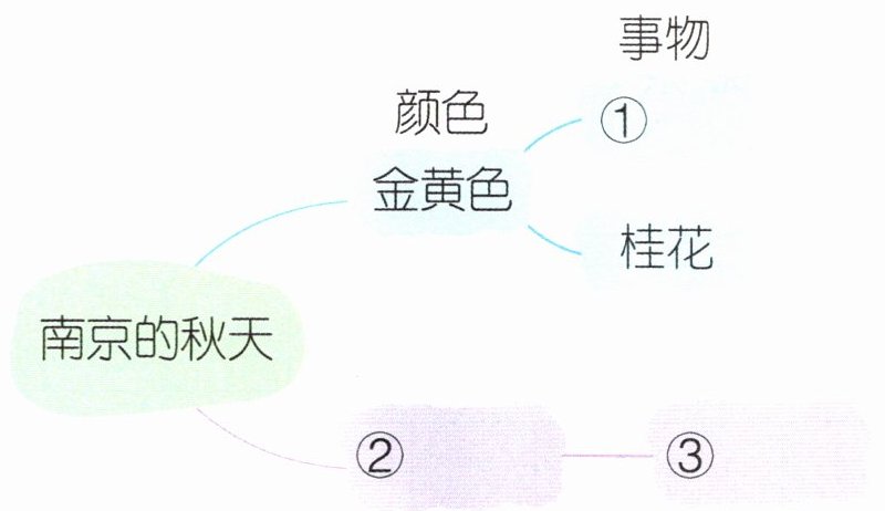 2. 获取信息 文章主要描写了南京的秋天的哪些颜色和事物?根据文章内容补全下图。(3分)