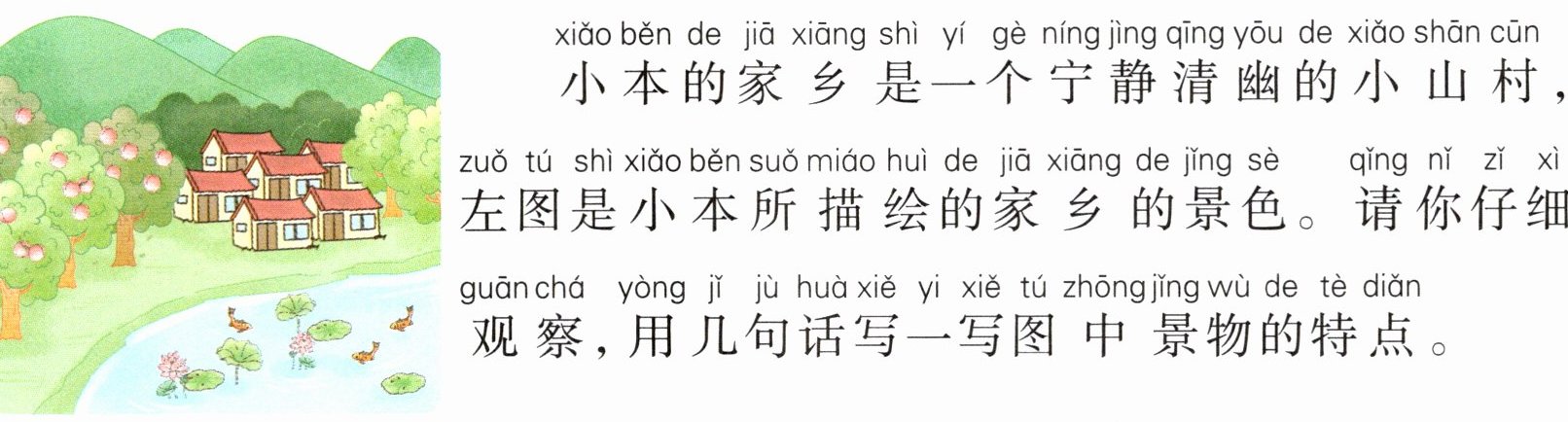 (示例) 夏天到了,宁静清幽的小山村就像一幅美丽的画。 小山村中,坐落着几座矮矮小小的房子,房顶的瓦片都是火红火红的,好像戴着一顶顶红帽子。 小山村的后面有几座连绵起伏的大山,山上长满了枝繁叶茂的大树,像给大山披上了一件碧绿的衣裳。 山村前的小池塘清澈见底,就像小山村明亮的眼睛。池塘里翠玉一般的荷叶又大又圆,像一把把小伞撑在池塘中。 啊,夏季的小山村真是美不胜收!