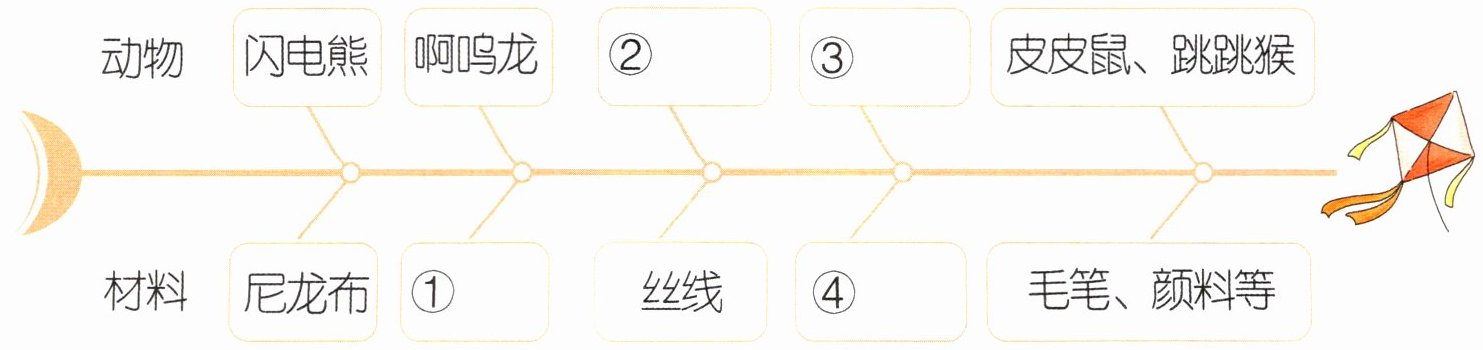1.获取信息 大家分别给熊爷爷送来了什么扎风筝的材料呢?根据文章内容填写下面的框图。(4分)