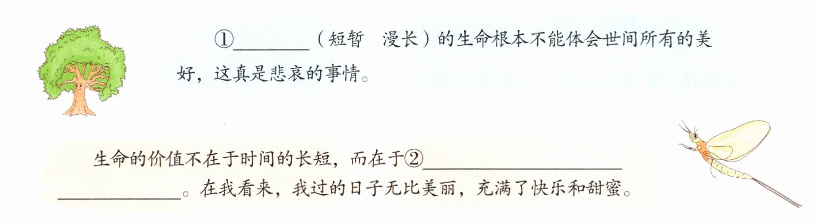 5. 形成解释 生命的价值和时间的长短有关系吗?请根据文章内容,补全老栎树和蜉蝣的对话。(2分)