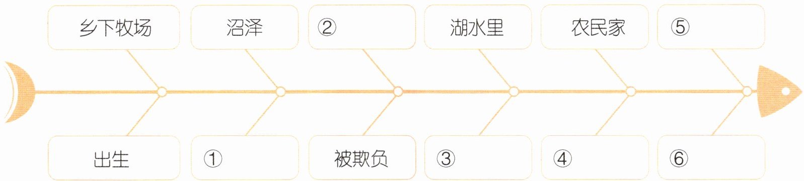 在《安徒生童话》中,我们认识了历经磨难的丑小鸭。请你根据故事发生的地点把情节串联起来,借助下图来回顾丑小鸭的经历吧。