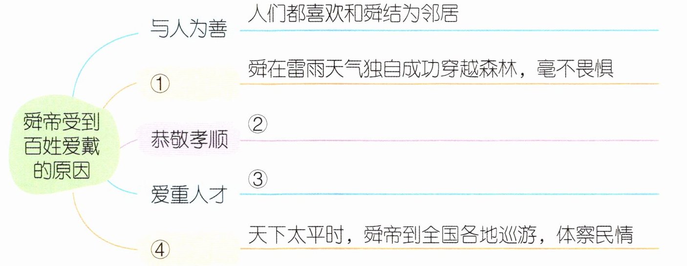 3. 评价鉴赏 舜帝为什么受到百姓的爱戴呢? 请你根据文章内容补充下面的导图。(4分)