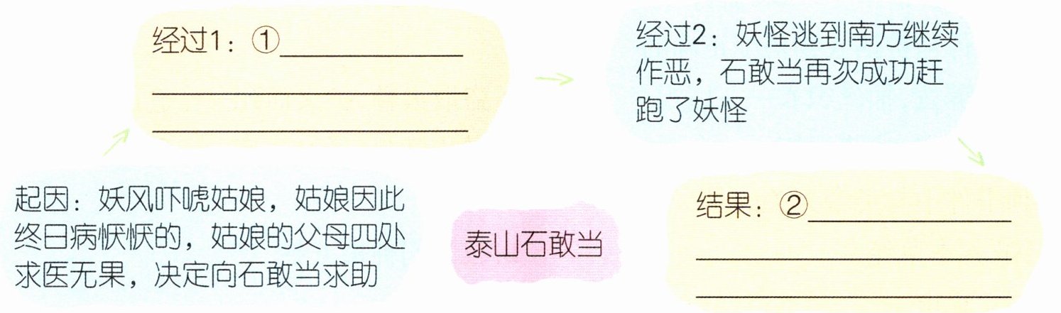 根据导图中的“起因”可定位到文章第1~3自然段,根据导图中的“经过2”可定位到文章第8自然段,据此可知“经过1”为第4~7自然段的主要内容,“结果”为第9~10自然段的主要内容。阅读文章可知,“经过1”可概括为“石敢当利用灯光和锣声吓跑妖怪,姑娘身体逐渐好了”;“结果”可概括为“石敢当用刻有‘泰山石敢当’的石头有效驱赶了妖怪和其他鬼怪”。