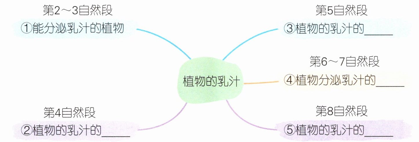 1.整体感知 文章主要是从哪几个方面来介绍植物的乳汁的? 阅读文章,把下图补充完整。(4分)