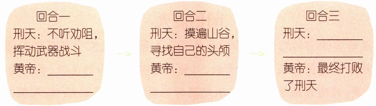 通读文章可知,文章第①②自然段主要讲述了刑天不服黄帝的统治,要和黄帝一决高下,而黄帝对刑天好言相劝,提出一起守护和平的家园的内容。下文中则讲述了刑天与黄帝进行了三个回合的战斗过程。第③④自然段是第一回合,主要讲述了刑天不听劝阻,挥动武器同黄帝战斗,而黄帝拔出宝剑开始反击,并且砍下了刑天的头颅的内容。第⑤⑥自然段是第二回合,主要讲述了刑天摸遍周围的大小山谷,寻找自己的头颅,黄帝则用宝剑劈开常羊山,埋葬刑天的头颅的内容。第⑦⑧自然段是第三回合,主要讲述了刑天把身躯变成新的头颅,双手挥舞盾牌和大斧,保持着战斗状态,而黄帝最终打败了刑天的内容。根据以上对故事情节的梳理,用简洁的语言填空即可。