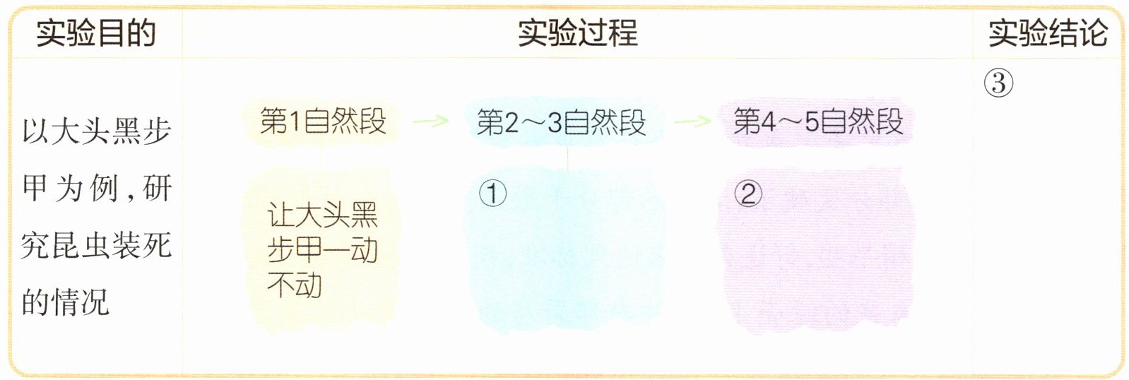 1. ①放表来记录大头黑步甲的静卧时间并观察其静卧状态 ②观察大头黑步甲“复活”后的反应,并进行多次实验 ③昆虫连续装死时,每一次的持续时间都不相同,长短不一