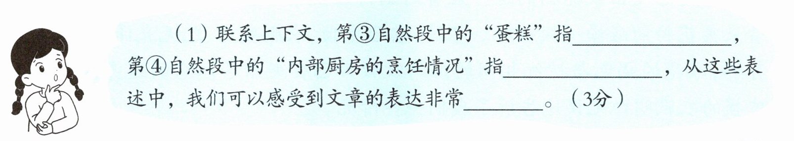 (1)联系上下文,第③自然段中的“蛋糕”指________,第④自然段中的“内部厨房的烹饪情况”指________,从这些表述中,我们可以感受到文章的表达非常________。(3分)