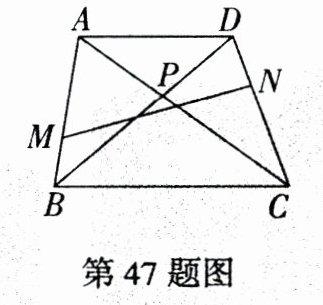 47. (2022陕西TYZ)如图,已知四边形 ABCD 的面积为90,对角线 AC 和 BD 相交于点 P,在四边形的两边 AB 和 CD 上分别取两点 M 和 N,且 MB= 1/3AB,BP= 3/5BD,NC= 2/3DC,PC= 2/3AC。