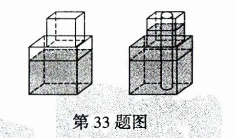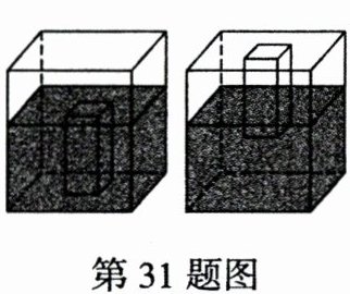 31. (2024 陕西 GDFZ)如图,一个正方体的密闭容器,棱长为 20 厘米,容器内盛有一些水,在容器的底部焊接着一个长方体实心铁块,铁块的上表面刚好与水面持平,当把容器倒置如图(此时铁块仍有一部分在水面以下)所示时,量得水面高度为 12 厘米,已知容器底面积是长方体铁块底面积的16 倍,则开始时水面高度为