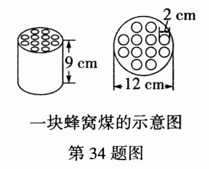 (2)①每块蜂窝煤中含煤$0.001125×80\%=0.0009$(t),则能够制成蜂窝煤的数量为$4.05÷0.0009=4500$(块)。 答:用这堆煤一共能制成4500块蜂窝煤。 ②$3×(\frac{12}{2})^{2}×9=972$(cm³),$3×(\frac{2}{2})^{2}×9×12=324$(cm³),则每块蜂窝煤体积为$972 - 324=648$(cm³),所有蜂窝煤的体积为$648×4500×\frac{1}{1000000}=2.916$(m³),原有煤的体积为$\frac{1}{3}×3×1.5^{2}×1.2=2.7$(m³),增加的体积为$2.916 - 2.7=0.216$(m³)。 答:制成的全部蜂窝煤的体积之和比这堆煤的体积增加了0.216立方米。
