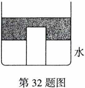32. (2023 陕西 GDFZ)如图,有一个足够深的水槽,底面是长为 16 厘米、宽为 12 厘米的长方形,原本在水槽里盛有 6 厘米深的水和 6 厘米深的油(油在水的上方),如果在水槽中放入一个长、宽、高分别为 8 厘米、8 厘米、12 厘米的铁块,那么油层的层高是多少厘米?