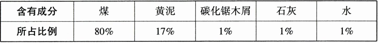 |含有成分|煤|黄泥|碳化锯木屑|石灰|水|