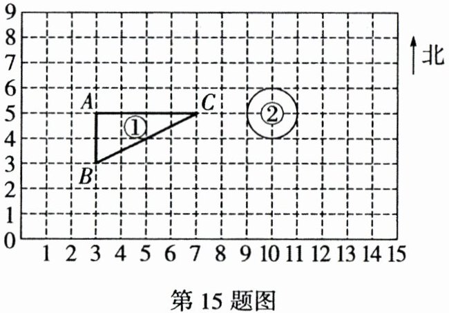 15. (2024陕西GX3C)(1)将图形①绕点A(3,5)逆时针旋转90°,画出旋转后的图形,旋转后,点B的位置用数对表示是(______,______)。