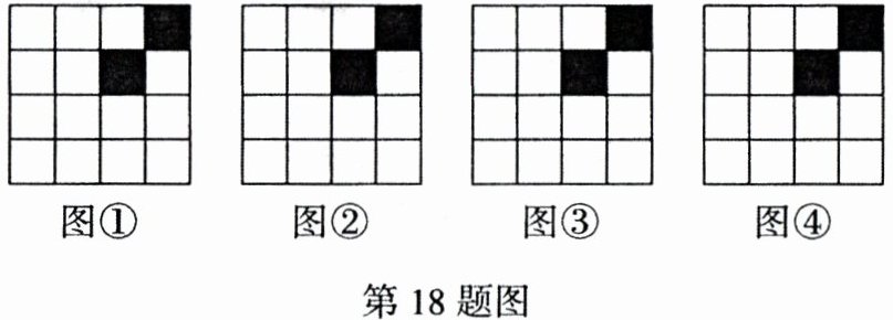18. (2022陕西GXYZ)如图是由16个小正方形组成的正方形网格图,现已将其中的两个涂黑。请你用四种不同的方法分别在下图中再涂黑三个空白的小正方形,使它成为轴对称图形。